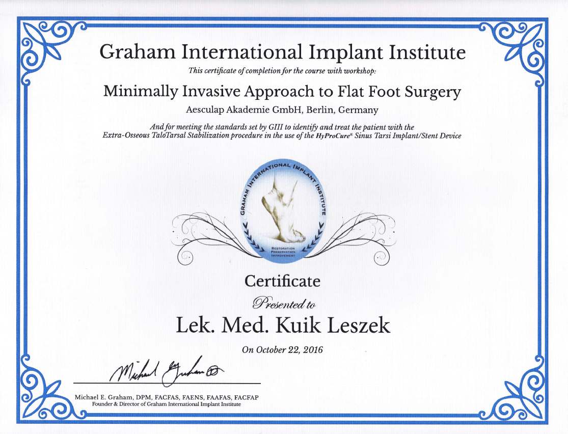 - Stopa płasko-koślawa / płaskostopie – Zabiegi korekcji tego typu deformacji wykonuję zarówno na NFZ jak i komercyjnie. Możliwości operacyjne są rozciągają się od kilkunastominutowych zabiegów typu HyProCure lub ProStop do rozległych operacji trwających 2 godziny lub więcej. Problem płaskostopia jest bardzo złożony, a każdy pacjent ma nieco inną konfigurację przestrzennych zniekształceń.